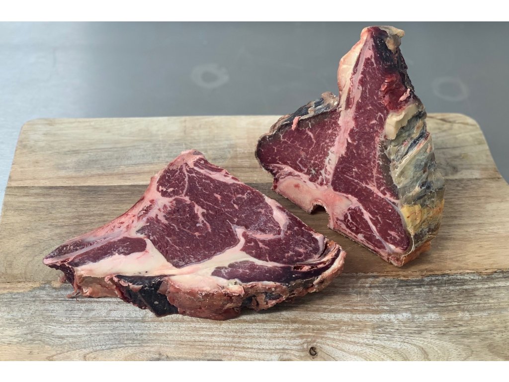 T-bone steak jsou vlastně 2 steaky v jednom, jde o řez, kde kosti tvoří tvar písmene T a na straně jedné naleznete nízký roštěnec a na straně druhé pravou svíčkovou. Jedná se o nejznámější druh steaků na celém světe, kde se prodává pod různými názvy T-bone, Porterhause, Fiorentina. Má lehké tukové krytí, které dodá steaku potřebnou šťavnatost a díky kosti i skvělou chuť.