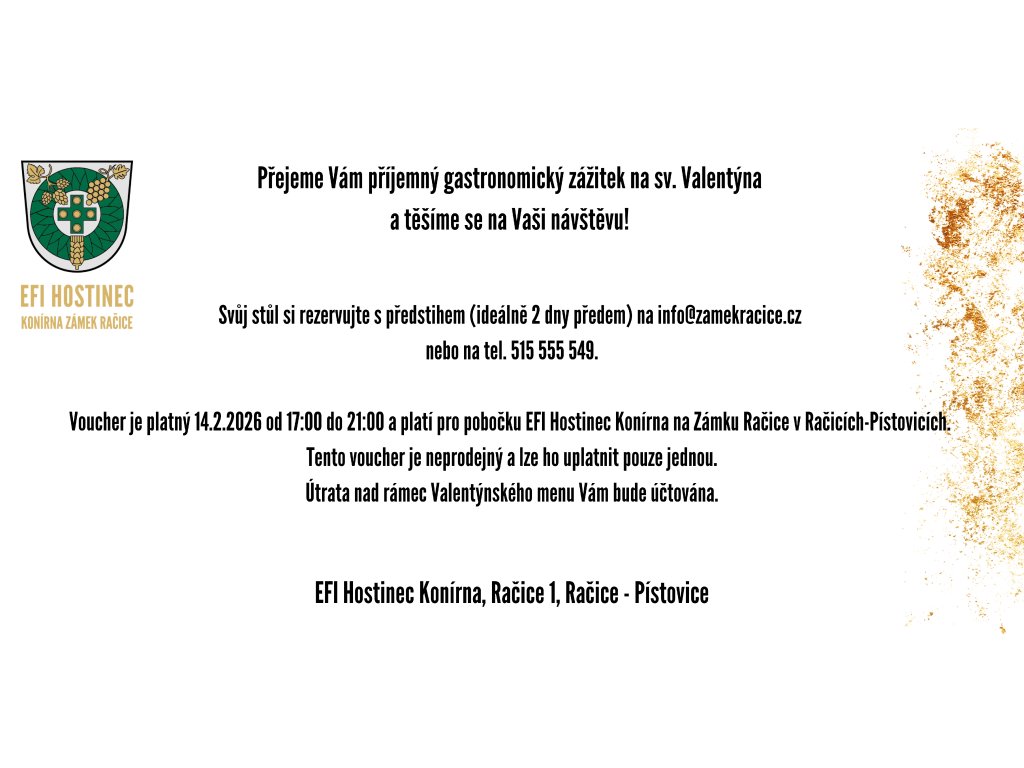 Voucher je ideální volbou pro romantickou večeři, výročí nebo jako elegantní valentýnský dárek.
